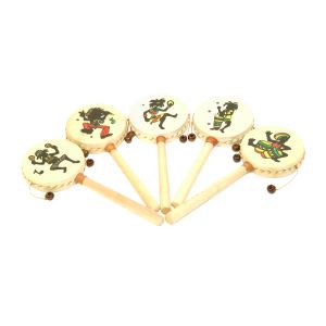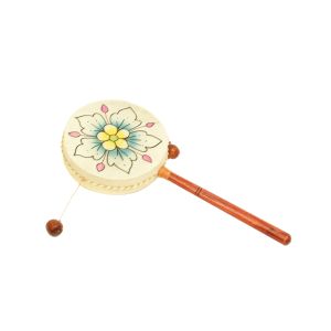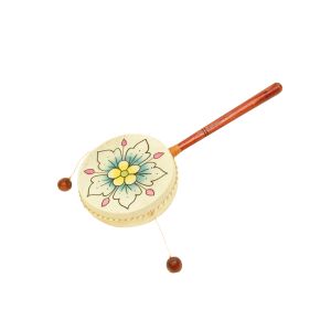 Die Handtrommel ist aus Ziegenhaut gefertigt und wird auf einem Stab befestigt. Links und rechts an den Seiten der Trommel hängt je eine Holzperle an einer Schnur geknüpft herab. Dreht man den Stab zwischen den Händen hin und her, so schlagen die Perlen die Trommel an. Die Buddha-Drum ist mit und ohne Dekor zu kaufen.